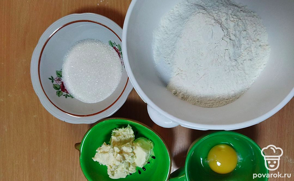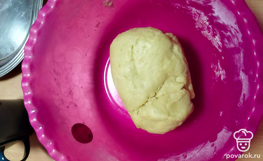 Отделите белки от желтков. 1 желток смешайте с 80 г сахара, добавьте масло комнатной температуры и муку, замесите тесто.