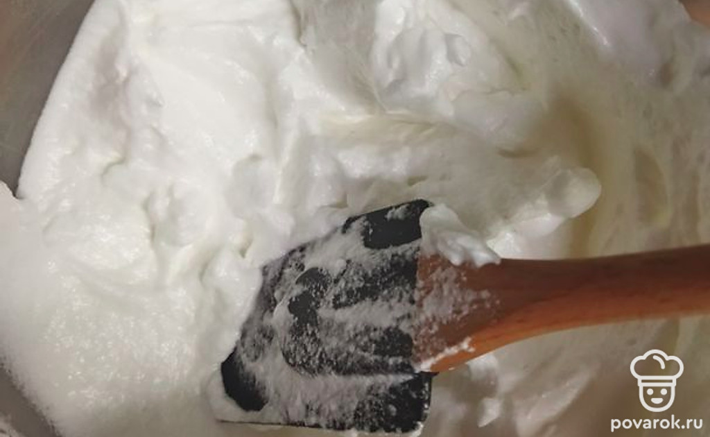Белки взбивайте в течение 10 минут на малых оборотах, постепенно увеличивая скорость. Оставшийся сахар нагревайте на малом огне до образования сиропа и горячим влейте в белок, продолжая взбивать еще 3 минуты.
