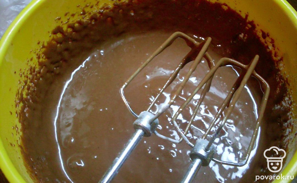 Яйцо взбейте с сахаром, постепенно добавляйте молоко и подсолнечное масло. Всыпьте в смесь какао, муку и разрыхлитель вымешивайте миксером до однородности.