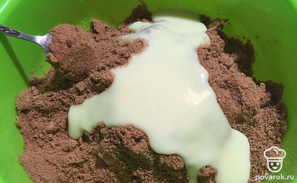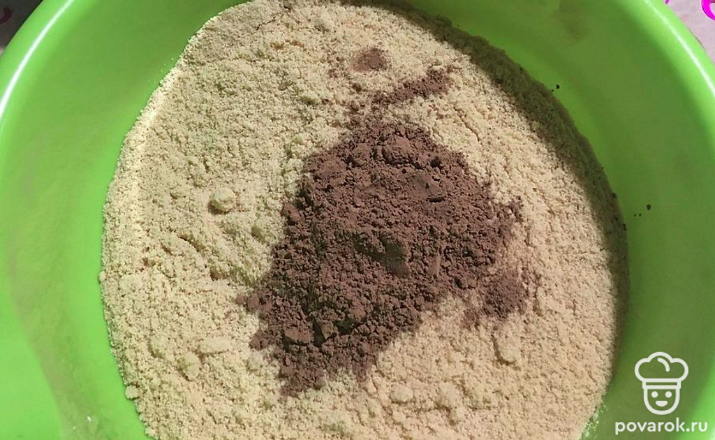 Печенье измельчите блендером (так масса будет однородной и без комочков, а значит лучше пропитается). Добавьте к печенью какао и хорошо перемешайте.