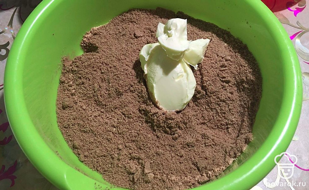 К перемешанному печенью с какао добавьте сливочное масло комнатной температуры.