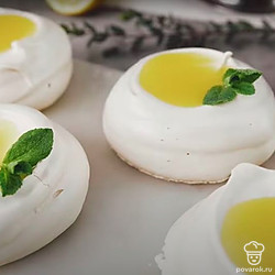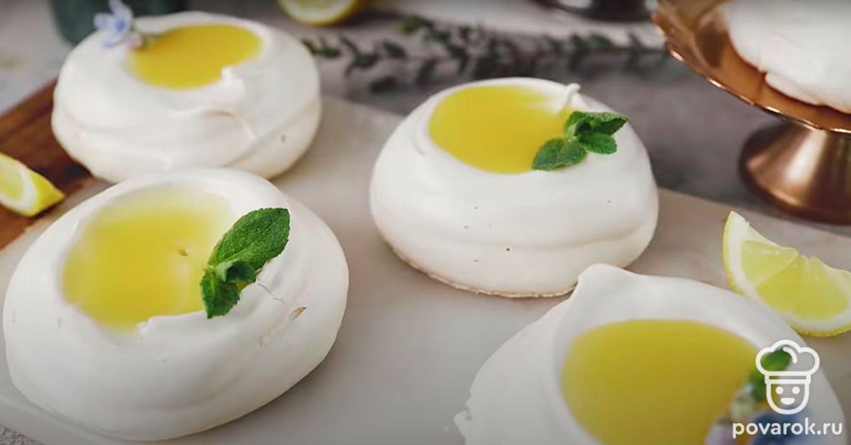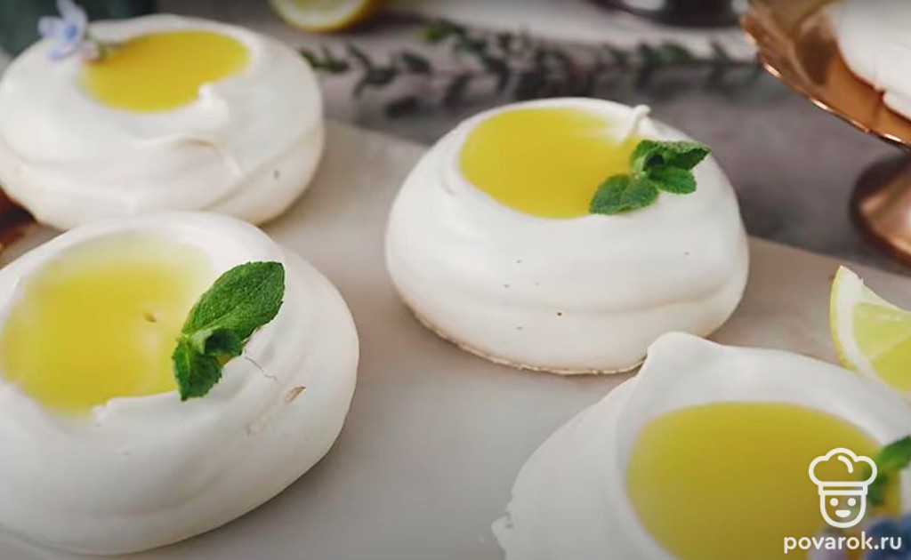 Влейте в центр «Павловой» курд и украсьте листиками мяты.