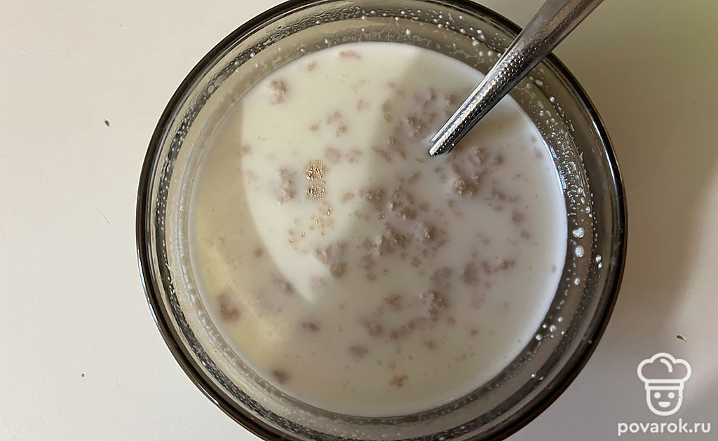 В отдельной емкости соедините дрожжи, теплое молоко, сахар и соль. Перемешайте и оставьте настаиваться (10 минут).