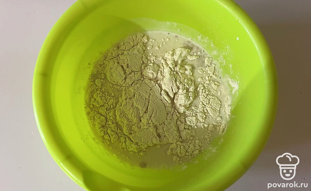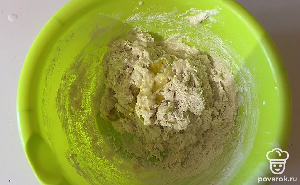 Настоявшуюся опару перелейте в глубокую миску. К ней просейте муку, перемешайте. Получится липкое тесто.