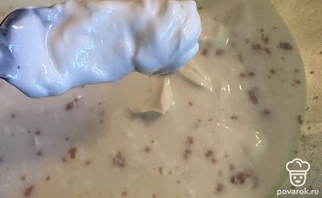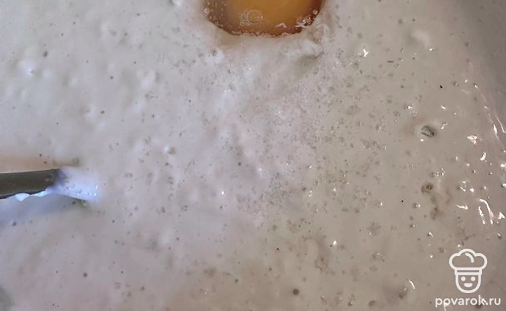 Вбейте яйцо и всыпьте муку, постоянно помешивая. Муки добавьте столько, чтобы получилось жидкое тесто. Тесто накройте полотенцем и уберите на 20 минут в теплое место.