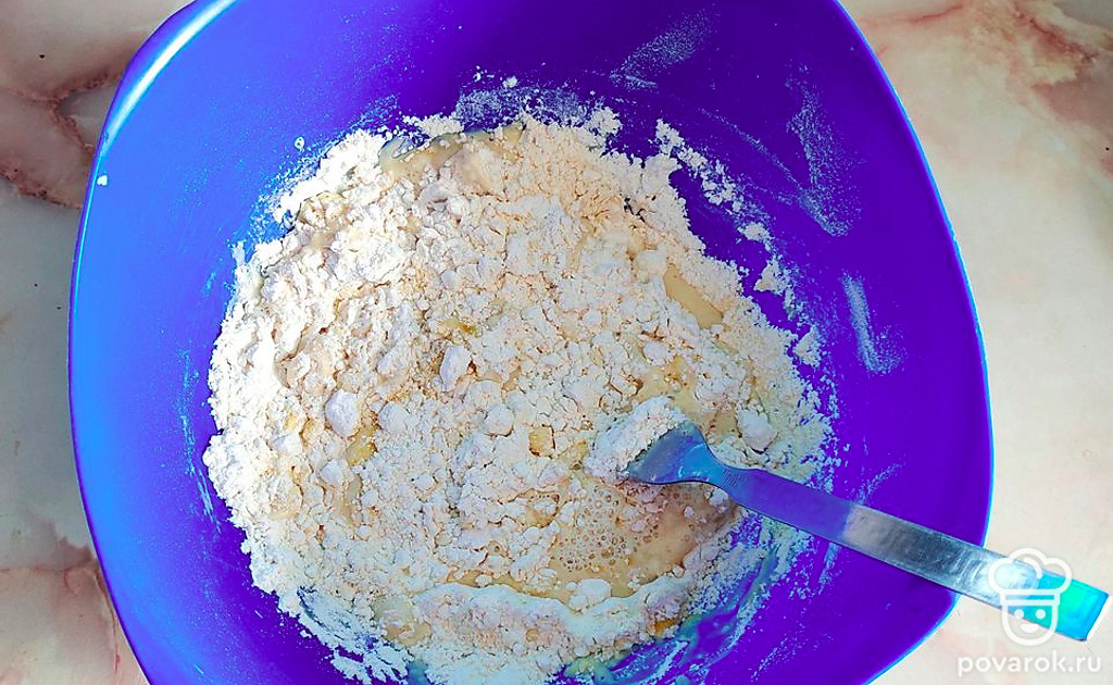 Добавляем яйцо с водой и тщательно перемешиваем.
