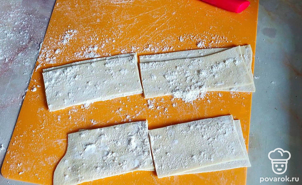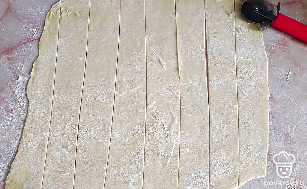 Раскатываем. Разрезаем на полоски. Можно использовать нож для пиццы.