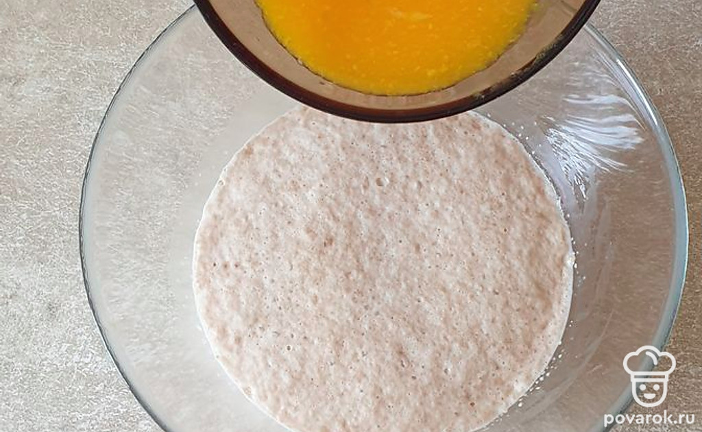 Сливочное масло растопите, смешайте с желтком и отправьте его к дрожжам и молоку.