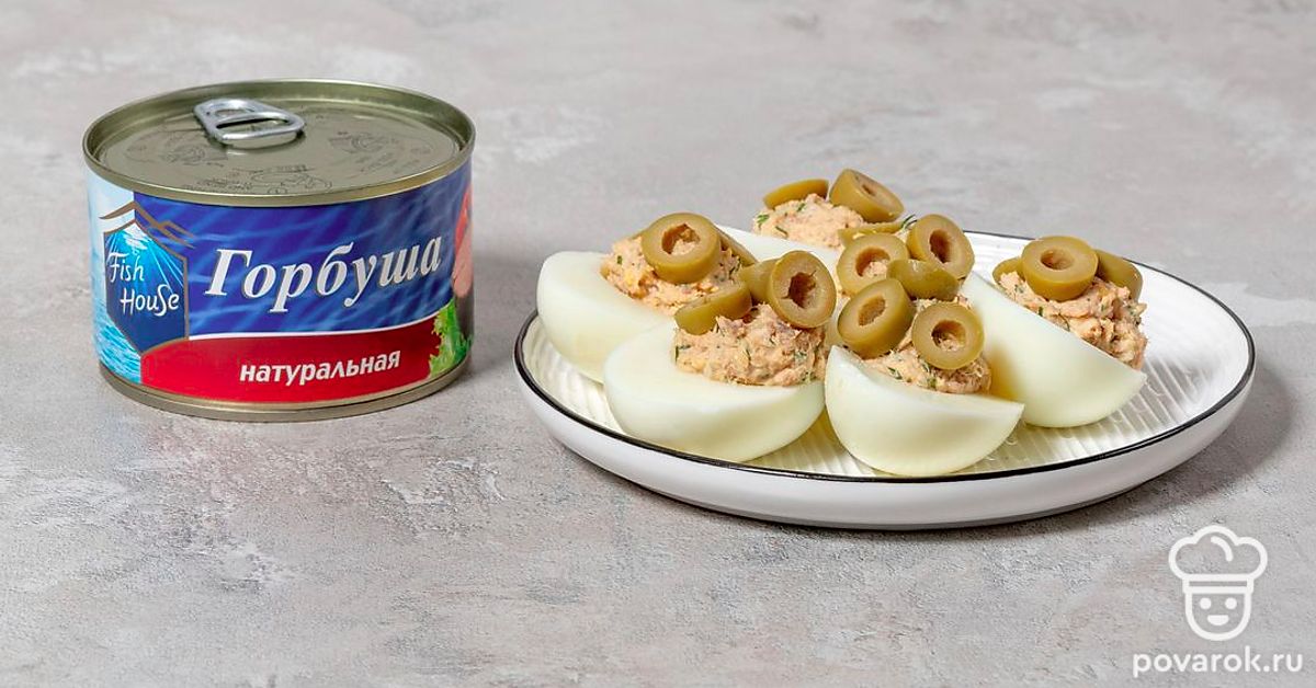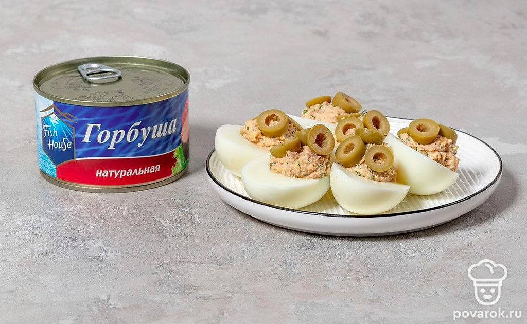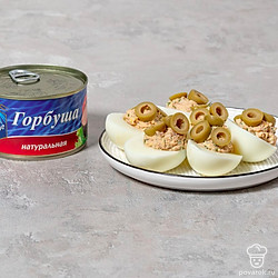 Украсьте яйца с рыбными консервами тонкими колечками оливок.