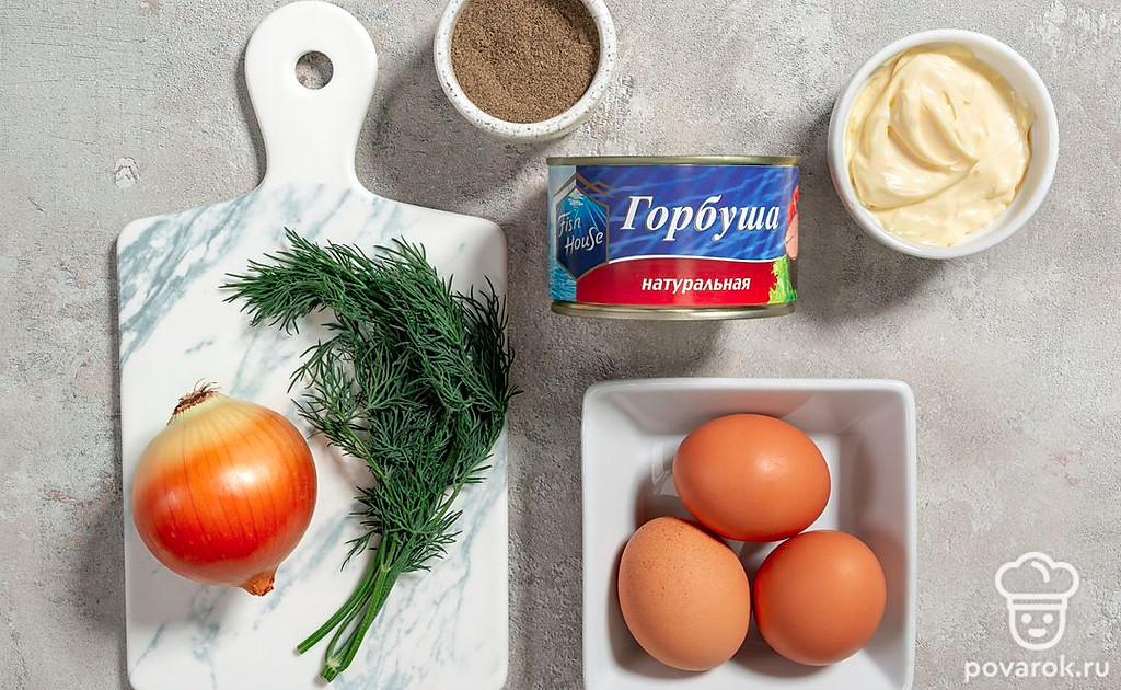 Помойте яйца. Вымойте и почистите лук. Ополосните и обсушите укроп. Откройте банку с горбушей, слейте жидкость, при необходимости удалите косточки из рыбы. Подготовьте небольшую кастрюлю, разделочную доску, миску и плоское круглое блюдо.