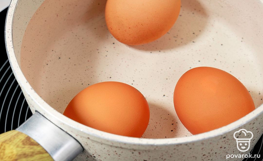 Выложите яйца в кастрюлю, залейте водой и поставьте на сильный огонь. Дайте воде закипеть, уменьшите огонь до среднего, отварите яйца 7-8 минут. Охладите яйца в ледяной воде в течение 10 минут, а затем очистите их от скорлупы.