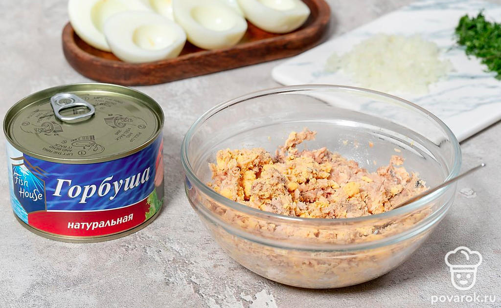 Разрежьте яйца вдоль, извлеките желтки. Разложите половинки белков на блюде срезами вверх. Переложите горбушу в миску, разомните вилкой. Добавьте к рыбе желтки, так же помните их вилкой. Мелко нарежьте репчатый лук, порубите укроп.