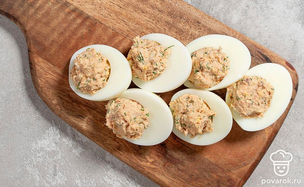Если на классическую «Мимозу» времени не хватает, сделайте из вареных яиц и рыбных консервов простую закуску. Фаршированные яйца получатся не менее вкусными и сытными, чем салат, но готовить их быстрее, а подавать — удобнее. Кроме репчатого лука и укропа можно добавить в начинку тертый твердый или мягкий творожный сыр, мелко нарезанные свежие или маринованные огурцы. Такие яйца хороши для украшения уже приготовленных салатов или блюд с тарталетками и нарезками.
