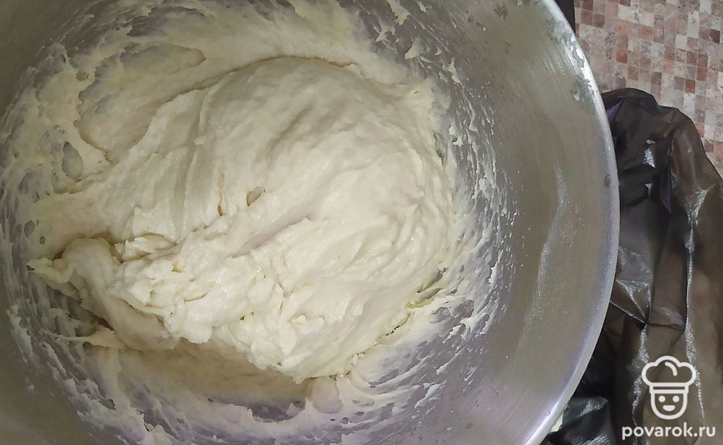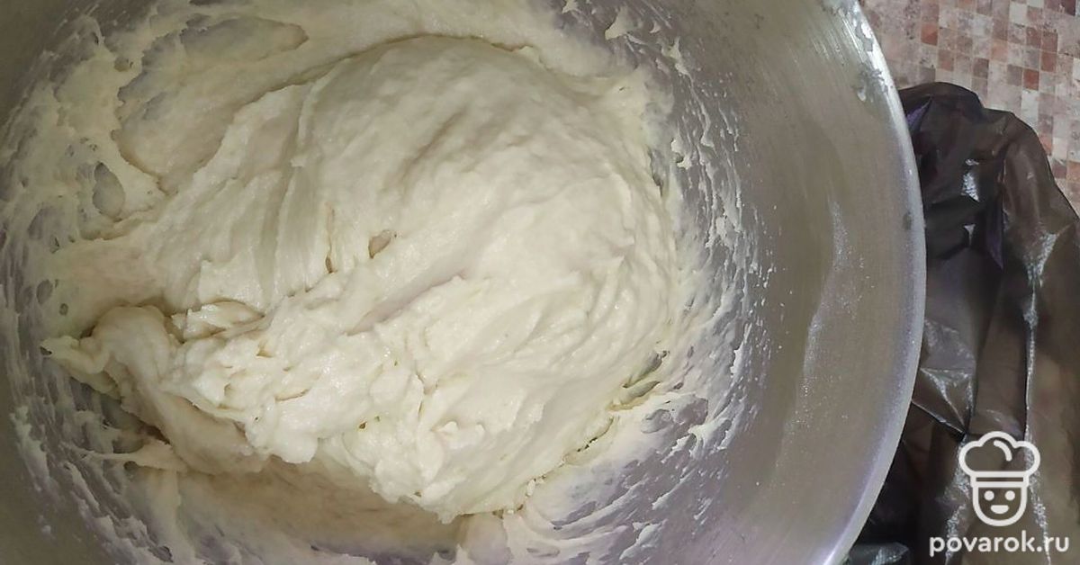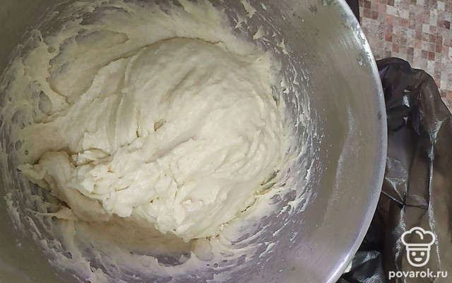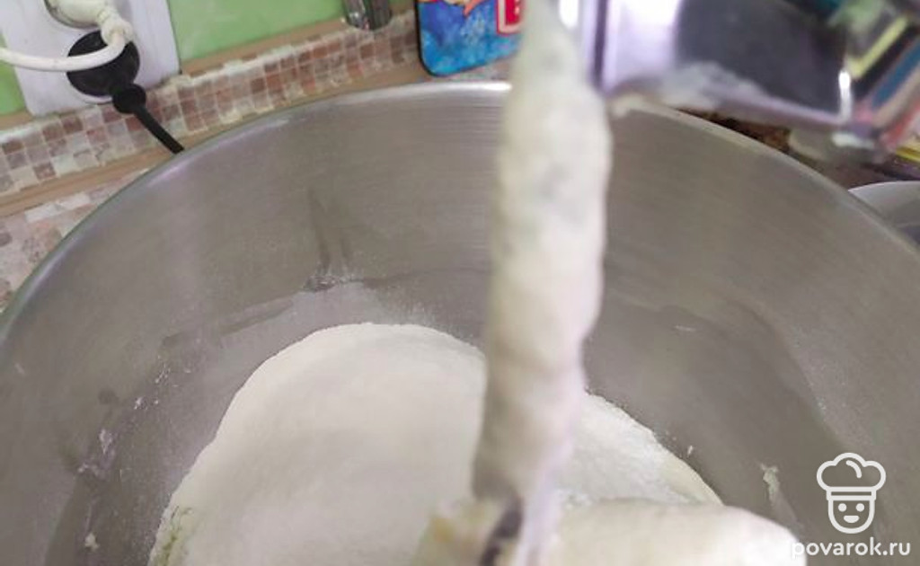 Начинаем вводить муку. Сначала 2 стакана. Потом третий и четвертый вводим по частям, должно получиться не очень крутое тесто, но чтобы его можно было сформировать.