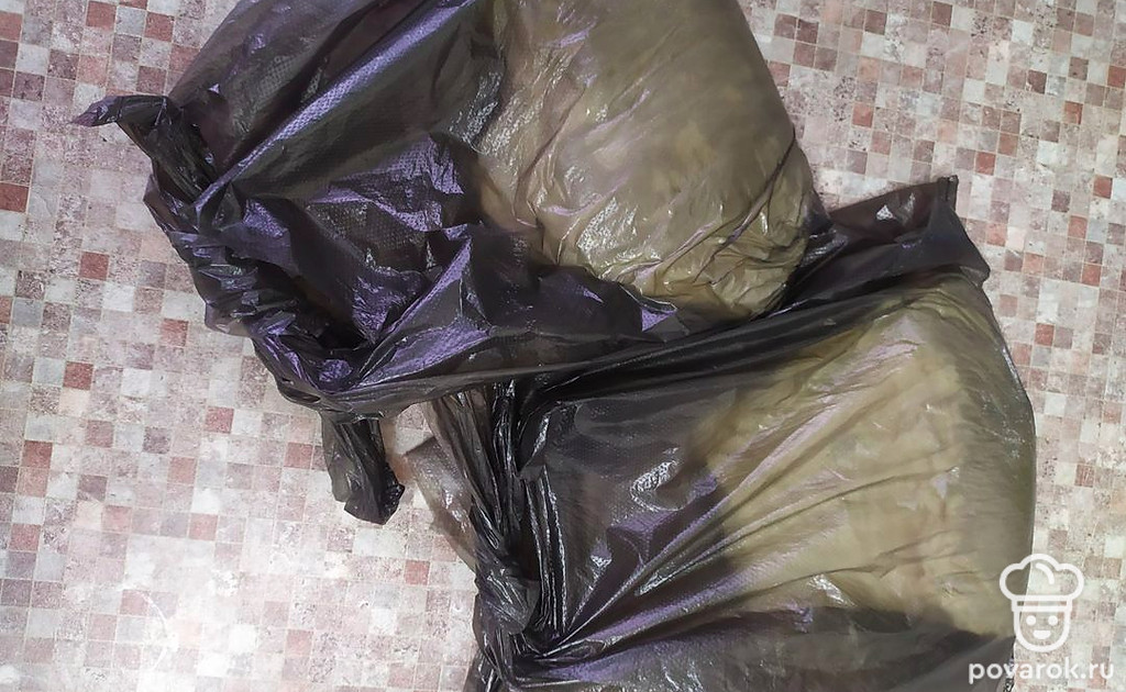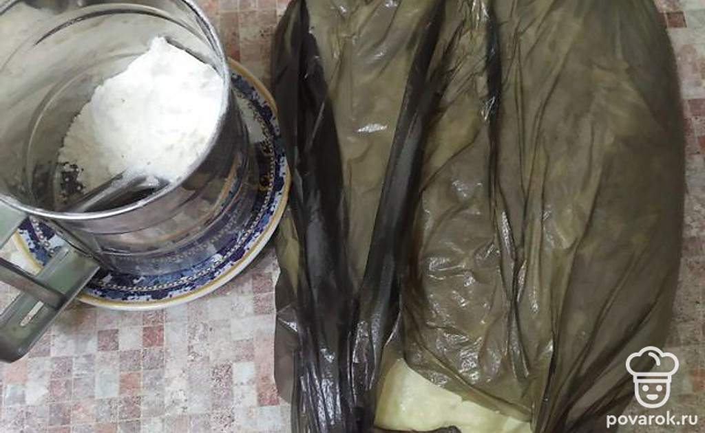 Теперь это тесто разделяем на две равные части и убираем каждую в пакет. И в холодильник на 30-60 минут.