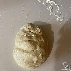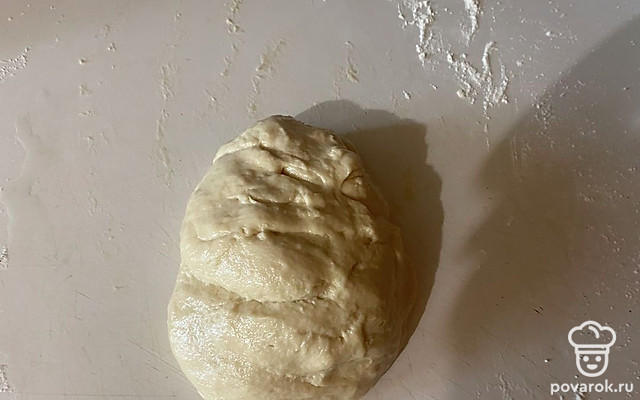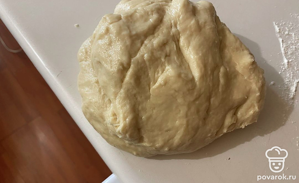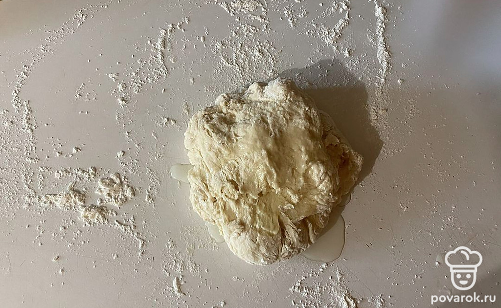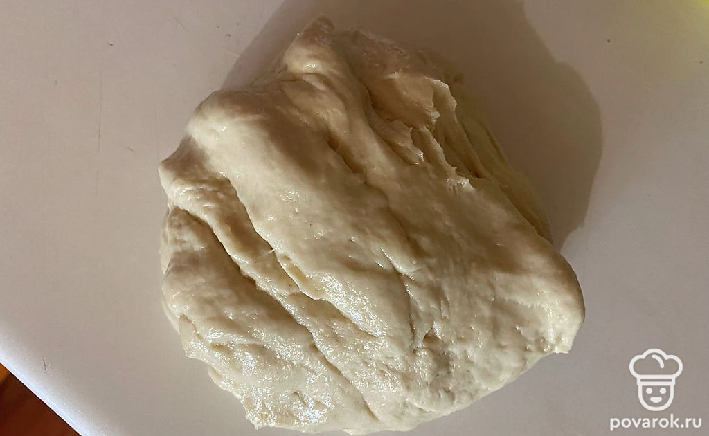 Далее требуется месить тесто около 10-15 минут, до тех пор, пока оно не перестанет липнуть к руками.