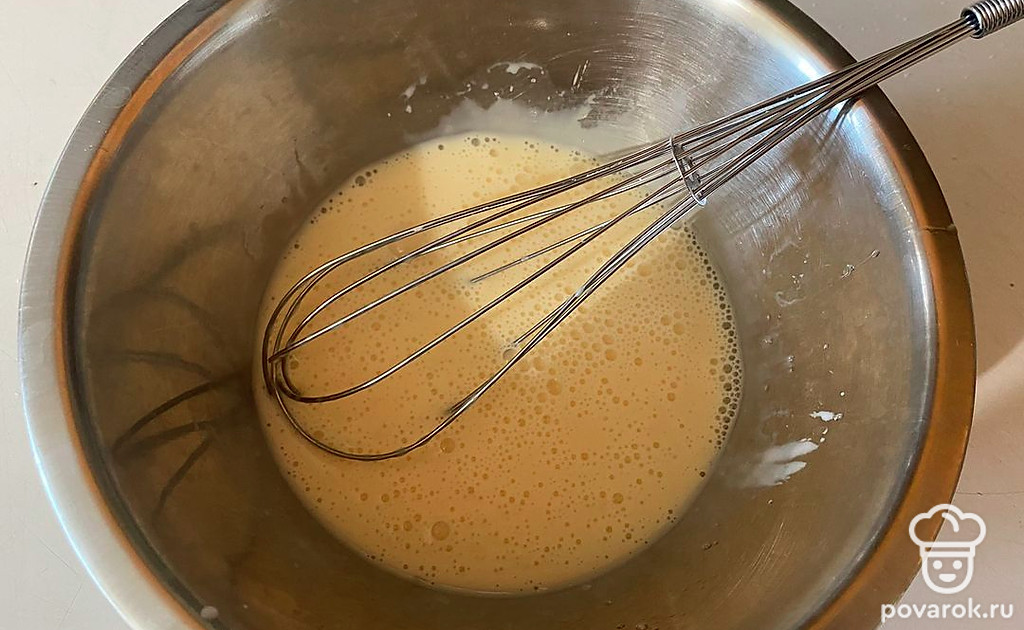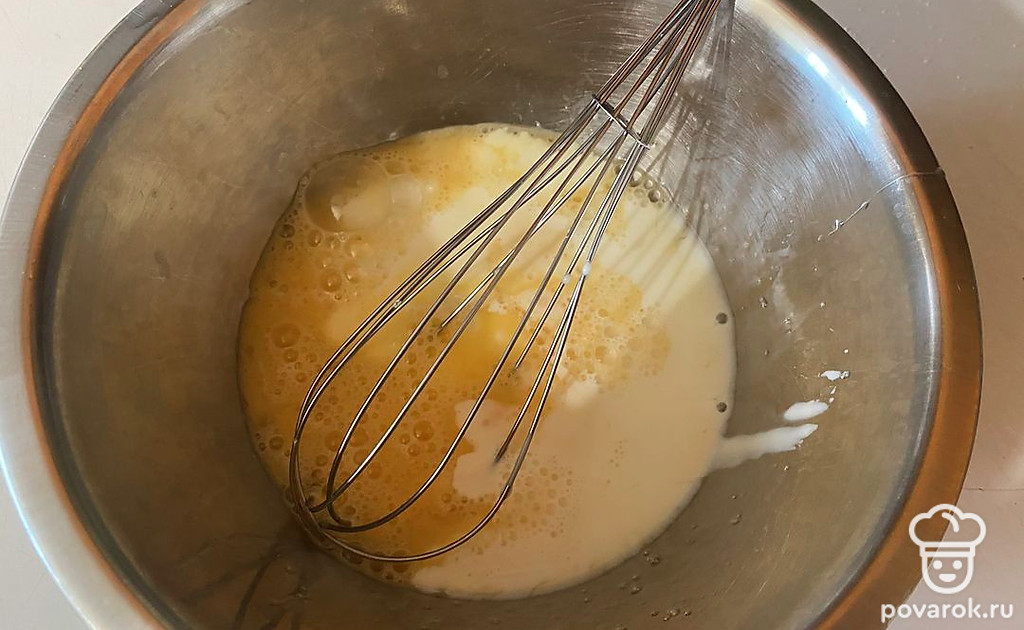 В миске соедините яйца, сахар, соль и молоко.