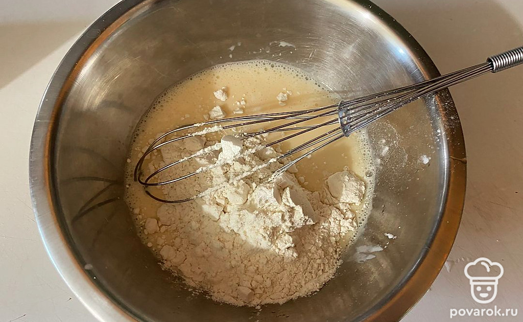К жидкой смеси добавьте 250 грамм муки.