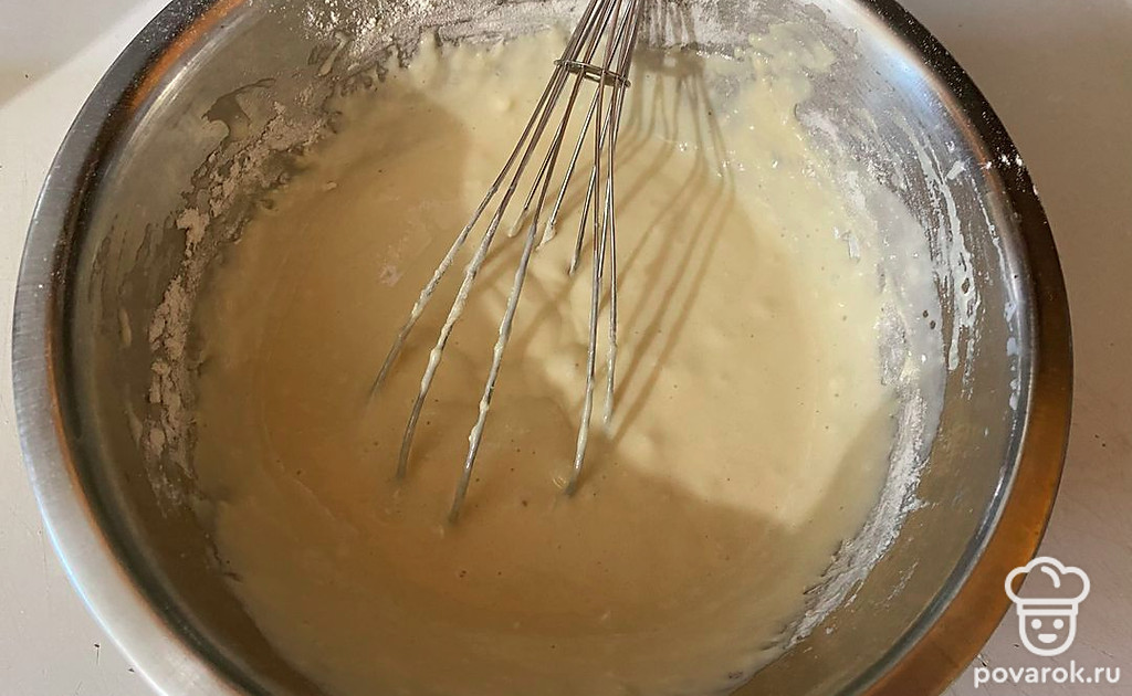 При помощи венчика вмещайте эту муку.
