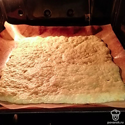 Тесто получается тугим и липким, поэтому распределяем тесто мокрыми руками по пергаменту или коврику.