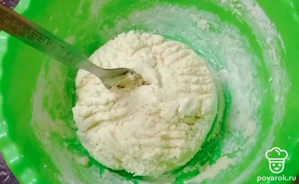 Смешиваем сначала творог, яйцо и соль вилкой, без использования миксера или блендера, так как при их использовании тесто получится жидким. Добавляем муку и продолжаем вымешивать вилкой.