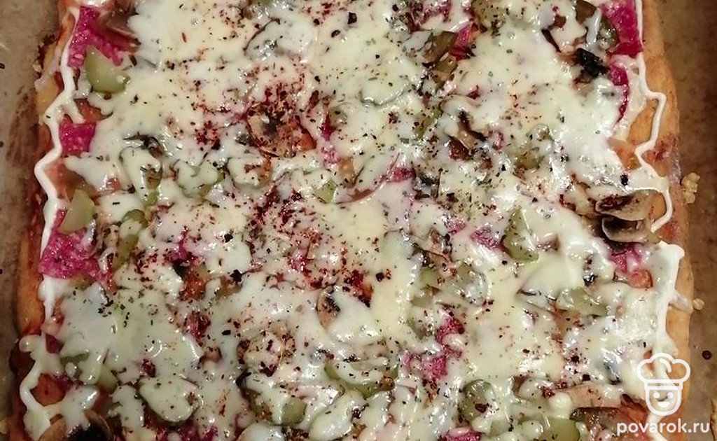 Выпекаем 12-15 минут до подрумянивания в разогретой до 180 градусов духовой печи. Далее переворачиваем и на румяной стороне распределяем соус и начинку. Ставим ещё на 7 минут в духовку до расплавки сыра. Так пицца всегда получается пропеченной.