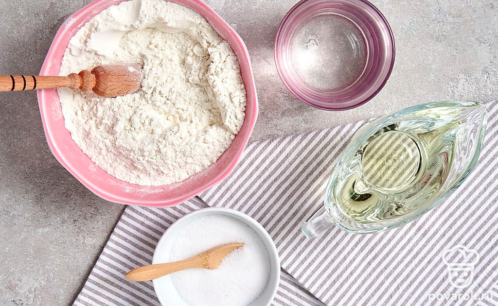 Отмерьте все ингредиенты. Воду предварительно доведите до кипения. Соедините муку и соль, дважды просейте их через сито. Подготовьте скалку, целлофановый пакет, противень и полотенце.