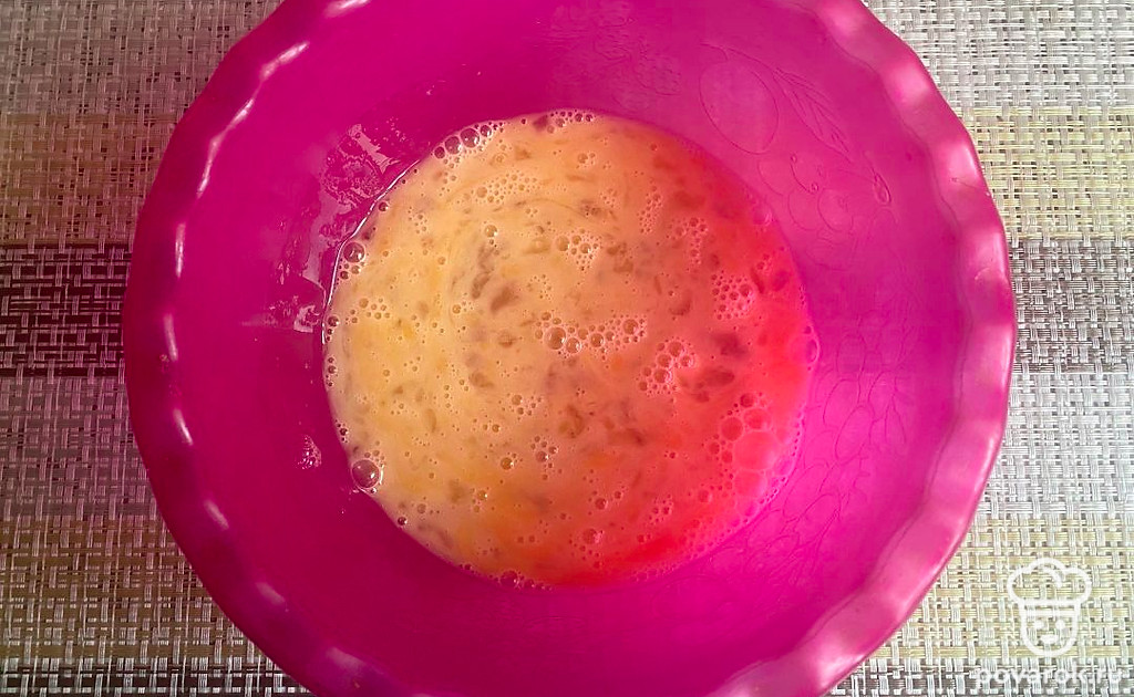 В миску разбейте куриные яйца и тщательно перемешайте венчиком.