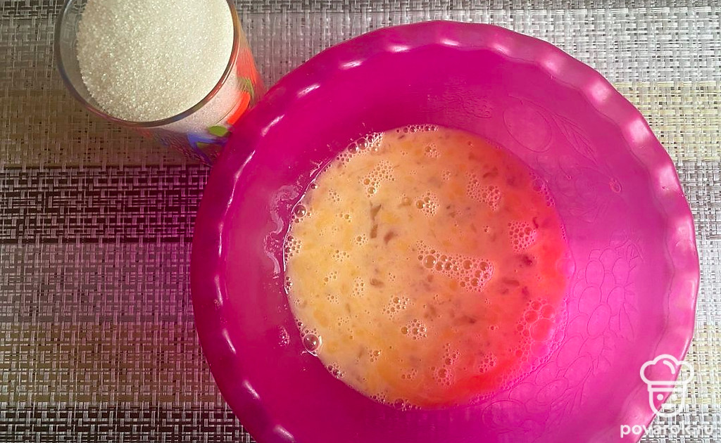 Всыпьте к яйцам сахарный песок. Перемешайте так, чтобы весь сахар растворился.