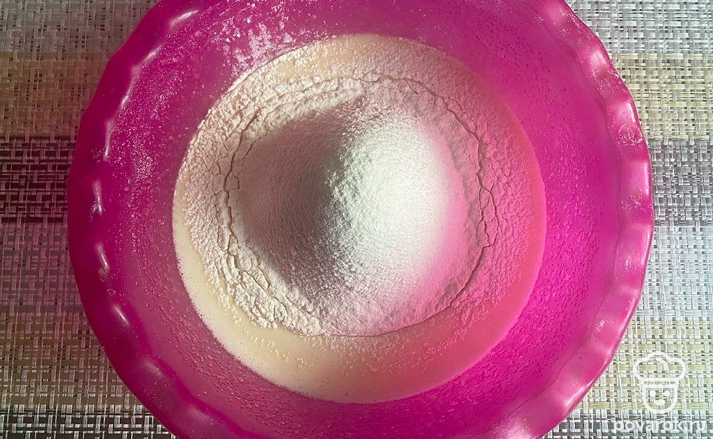 Просейте туда же через сито муку. Снова перемешайте, не допуская образования комочков.