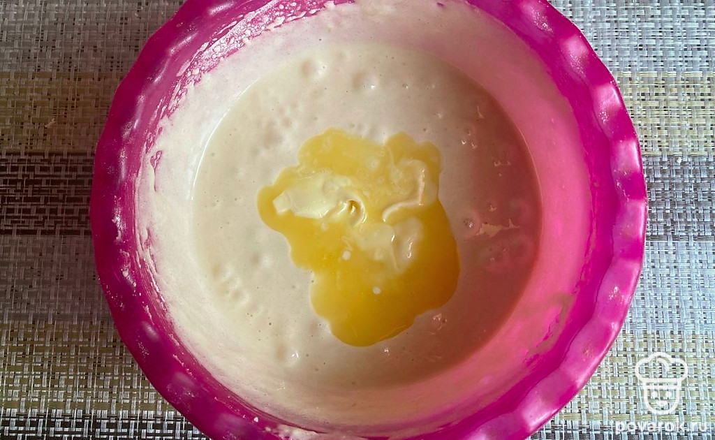 Растопите сливочное масло, добавьте в тесто. Опять перемешайте.