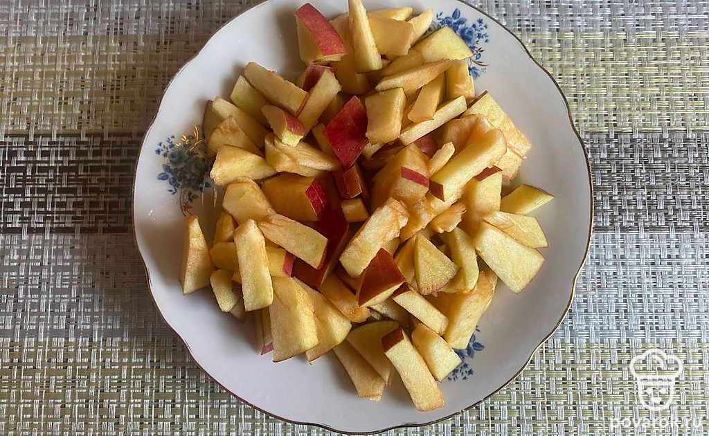 Точно такими же кусочками нарежьте яблоко среднего размера.