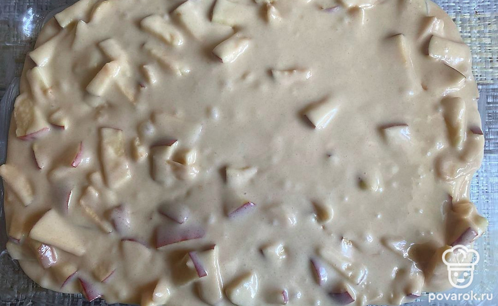 Смешайте яблоко, нектарин и тесто. Вылейте все в блюдо для запекания.