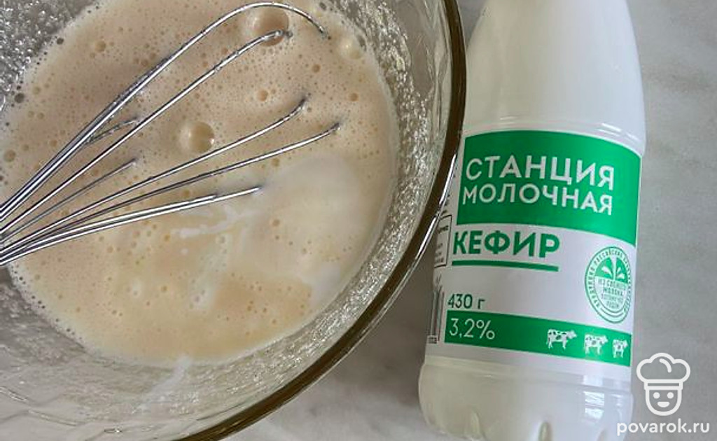Влейте в яично-сахарную смесь кефир. Перемешайте.