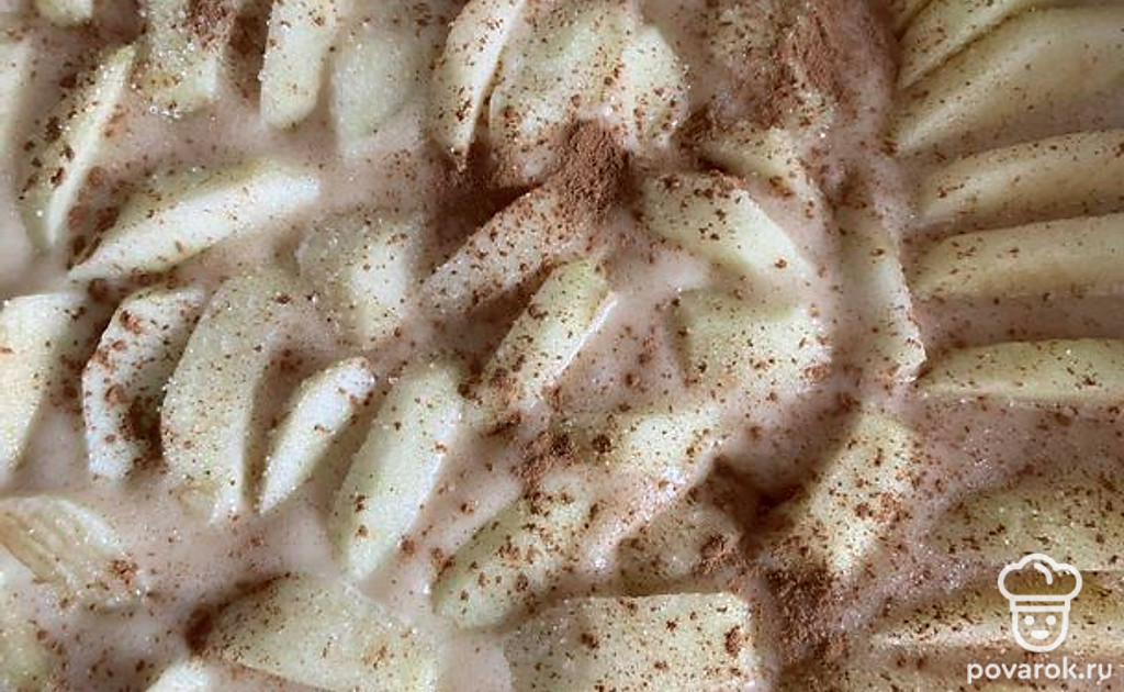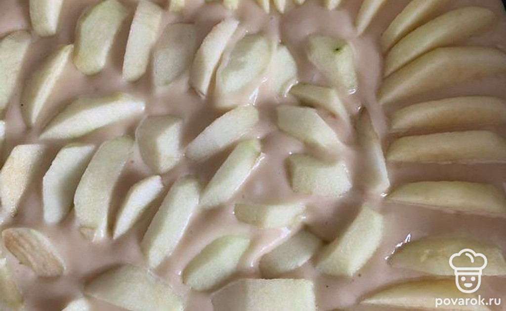 Почистите яблоки, нарежьте дольками и выложите на тесто по всему периметру, слегка вдавливая.