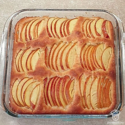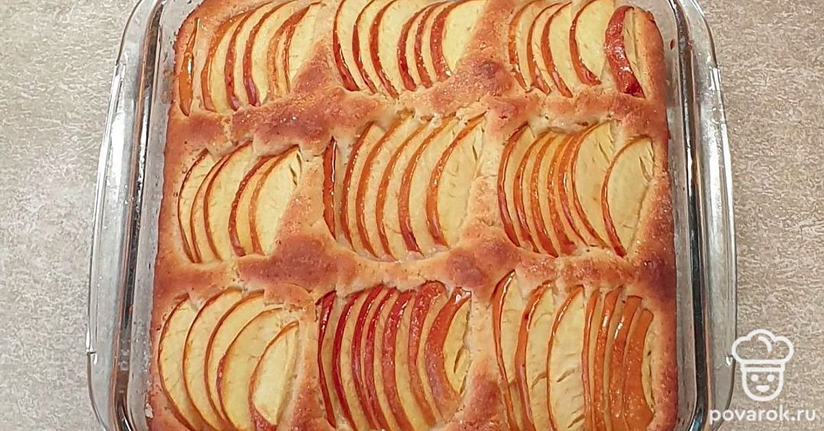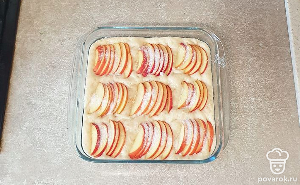 Яблоки помойте, удалите семена и нарежьте тонкими слайсами. На тесто выложите нарезанные яблоки и слегка посыпьте сахаром. Выпекайте в заранее разогретой до 180 градусов духовке 25-30 минут (режим «Верх-низ»).