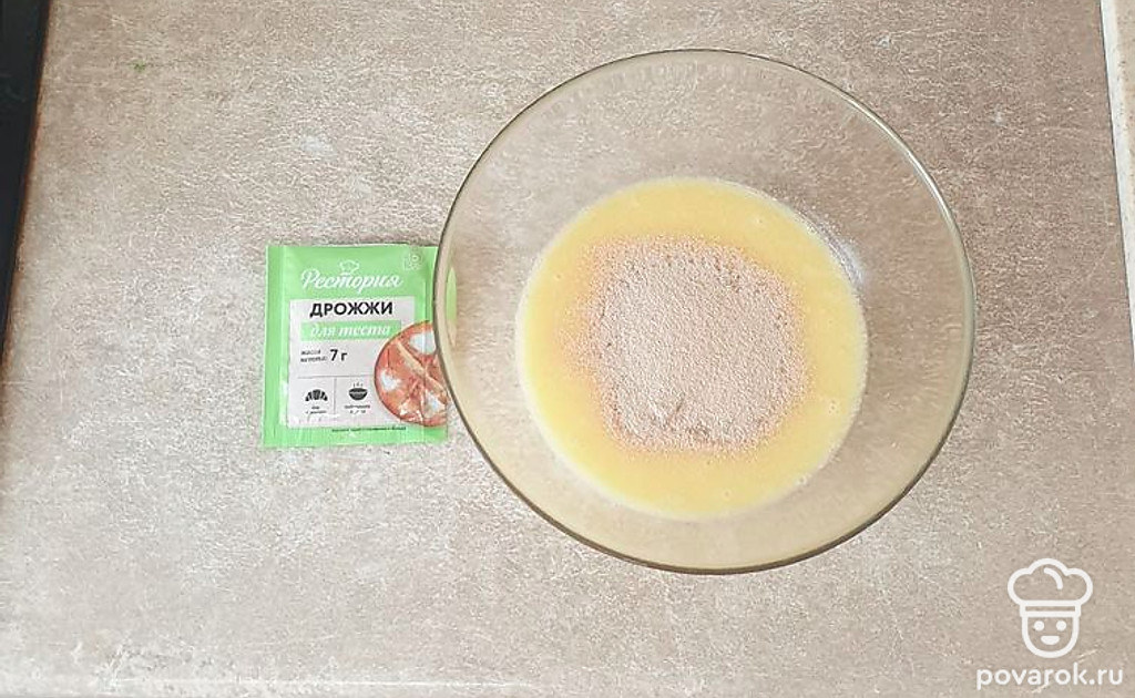 К остальным ингредиентам всыпьте сахар и дрожжи, хорошо перемешайте до растворения сахара.