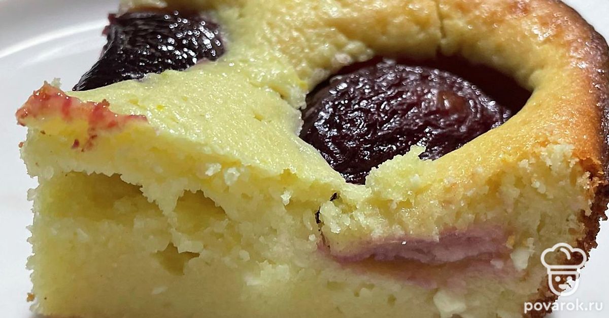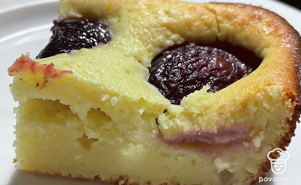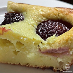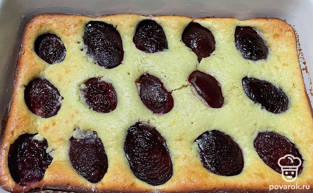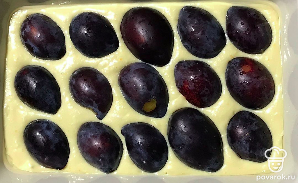 Сливы разрежьте пополам. Тесто распределите по форме. Выложите сливы, слегка утапливая их в тесто. Выпекайте пирог 35-40 минут при 180 градусах.