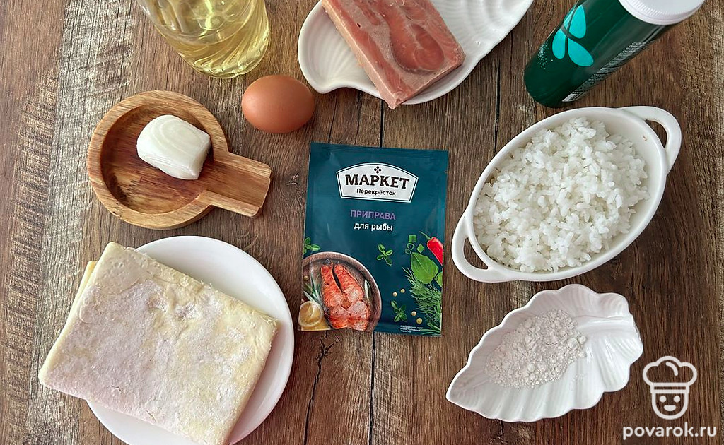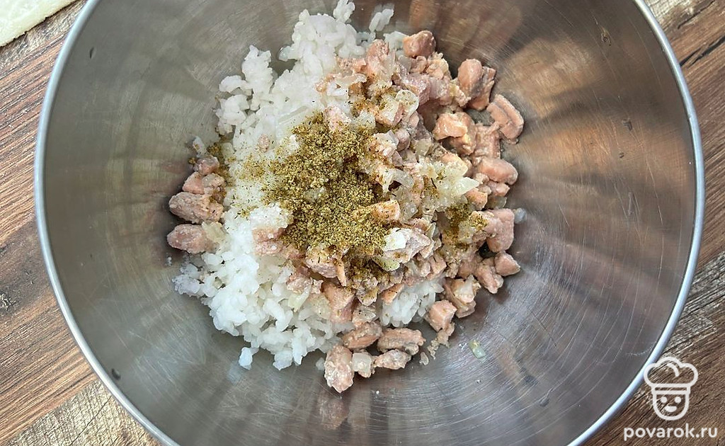 К рису добавьте лук с рыбой, приправу для рыбы и посолите по вкусу. Перемешайте.