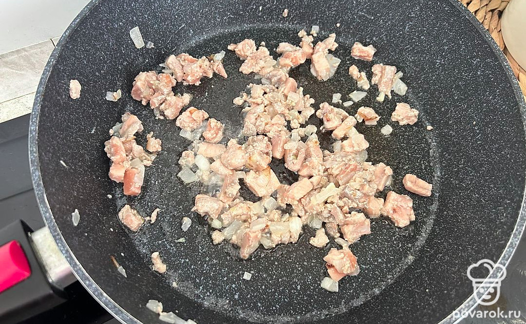 Горбушу нарежьте кубиком и обжарьте вместе с луком еще 5 минут.