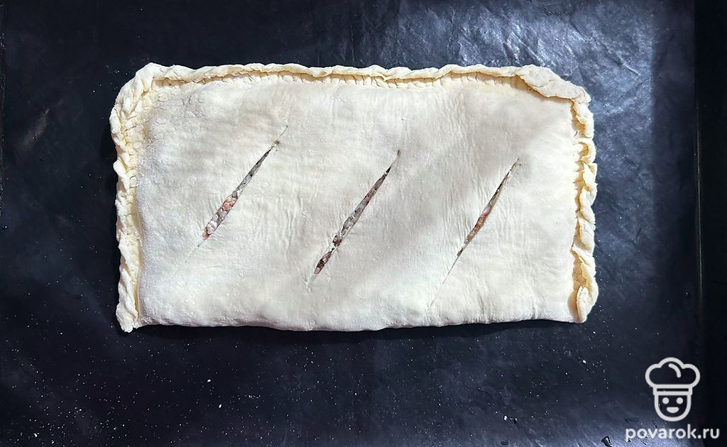 Противень застелите ковриком для выпечки. Выложите пирог. Сделайте три надреза.