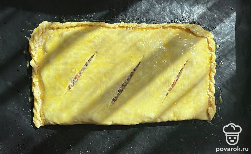 Смажьте заготовку яйцом. Отправьте в разогретую до 180 градусов духовку на 25-30 минут.