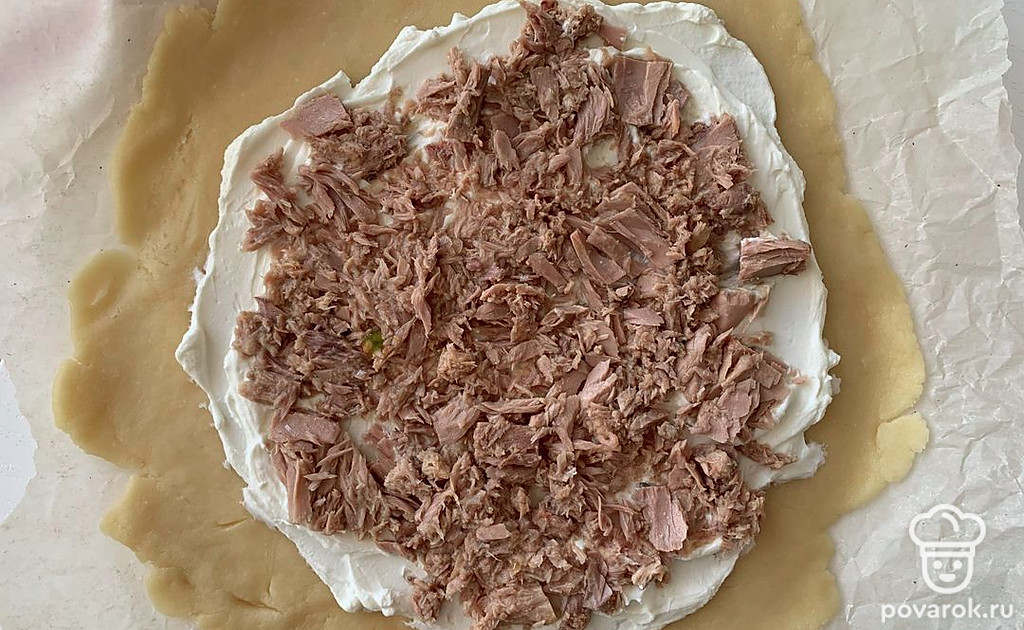 Тесто раскатайте, переложите на пергамент и смажьте творожным сыром.