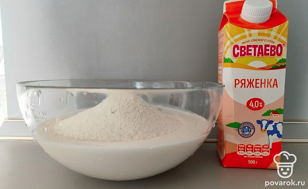 Ряженку комнатной температуры влейте в миску. Манную крупу всыпьте в ряженку и перемешайте. Оставьте смесь на 30 минут на столе.