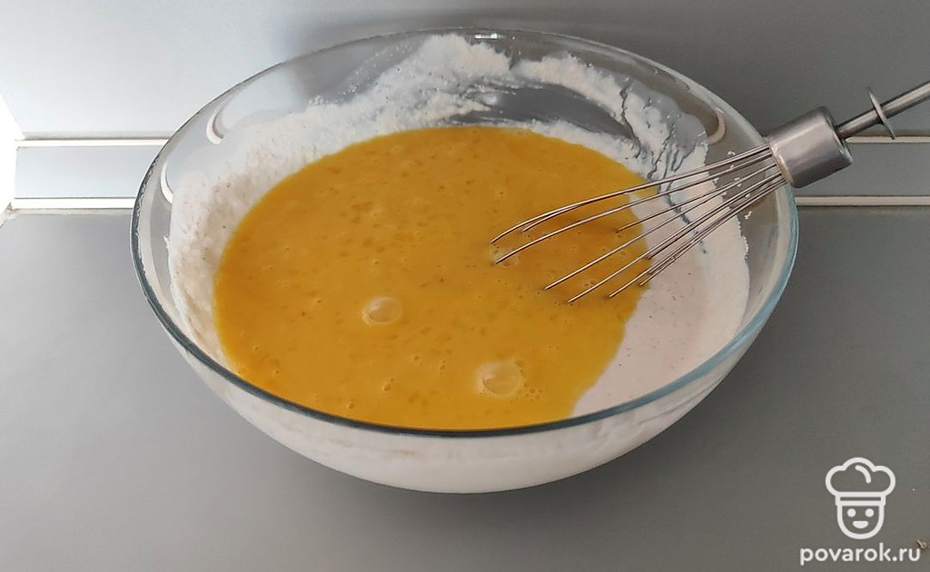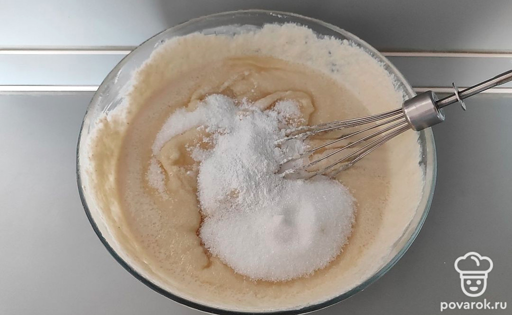 Затем всыпьте в миску разрыхлитель, сахар и снова хорошо перемешайте.