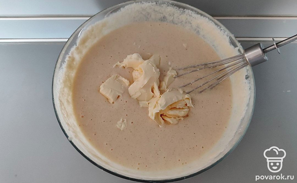В последнюю очередь добавьте в смесь сливочное масло комнатной температуры и перемешайте. Тесто получится довольно жидким.