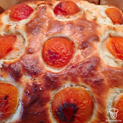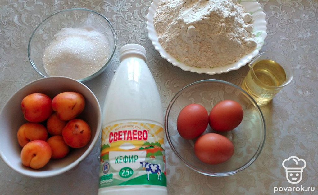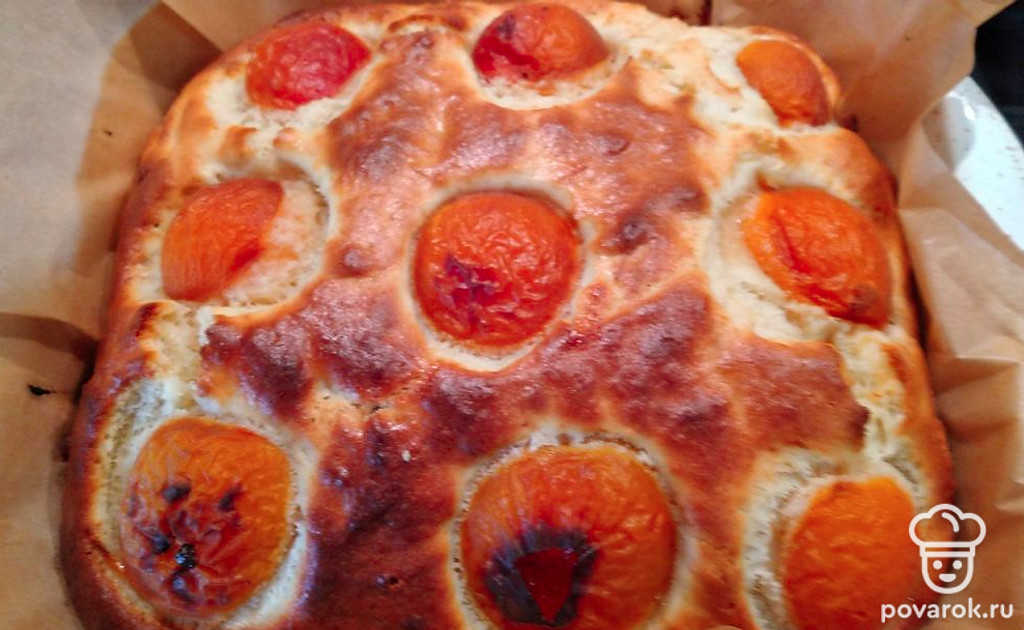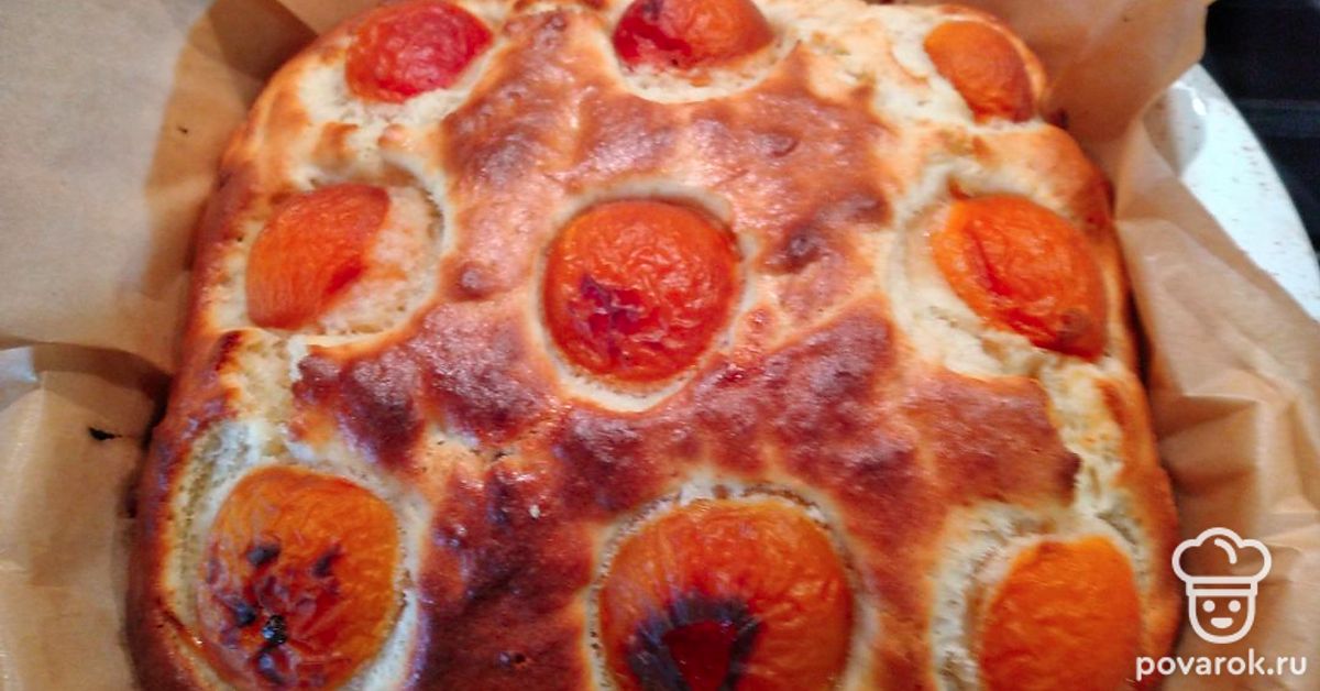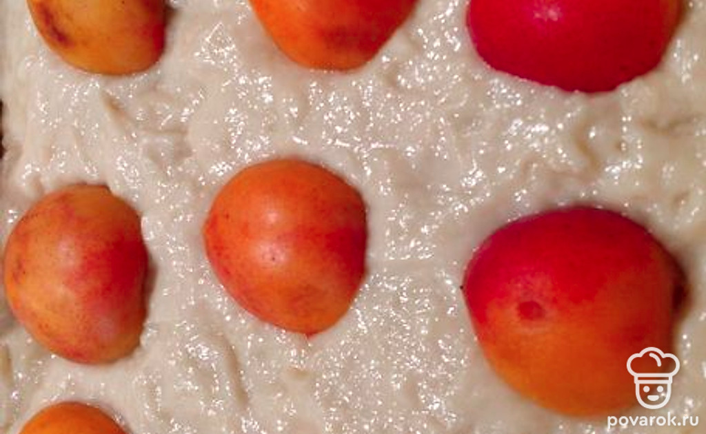 Выложить тесто в форму. Сверху выложите половинки абрикосов. Отправьте в разогретую духовку на 30 минут при 180 градусах.