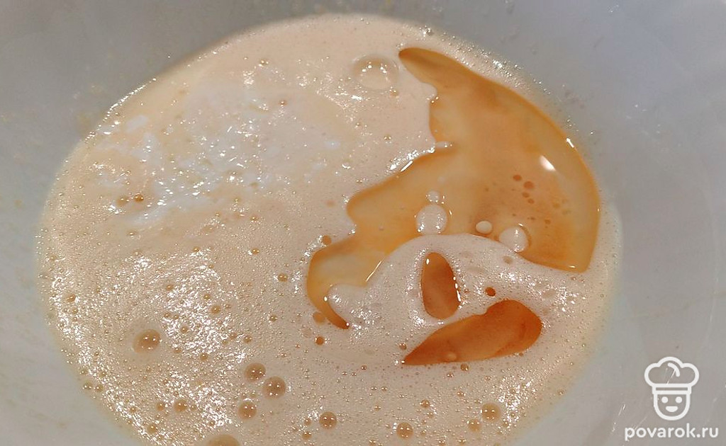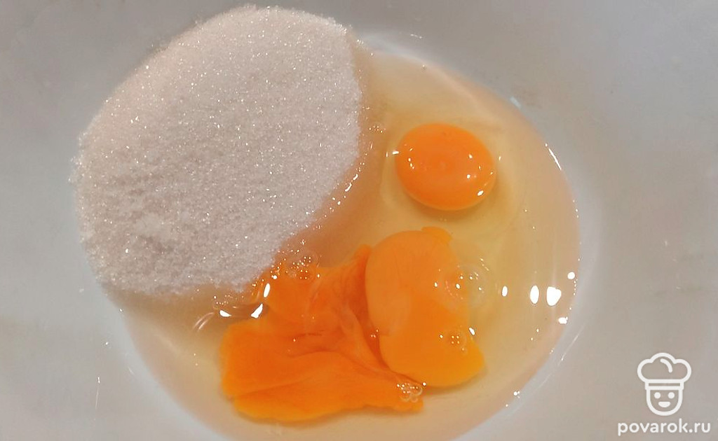 В миску вбейте яйца. Добавьте сахар и соль, хорошо взбейте.