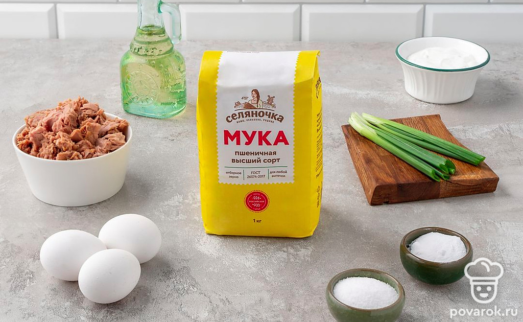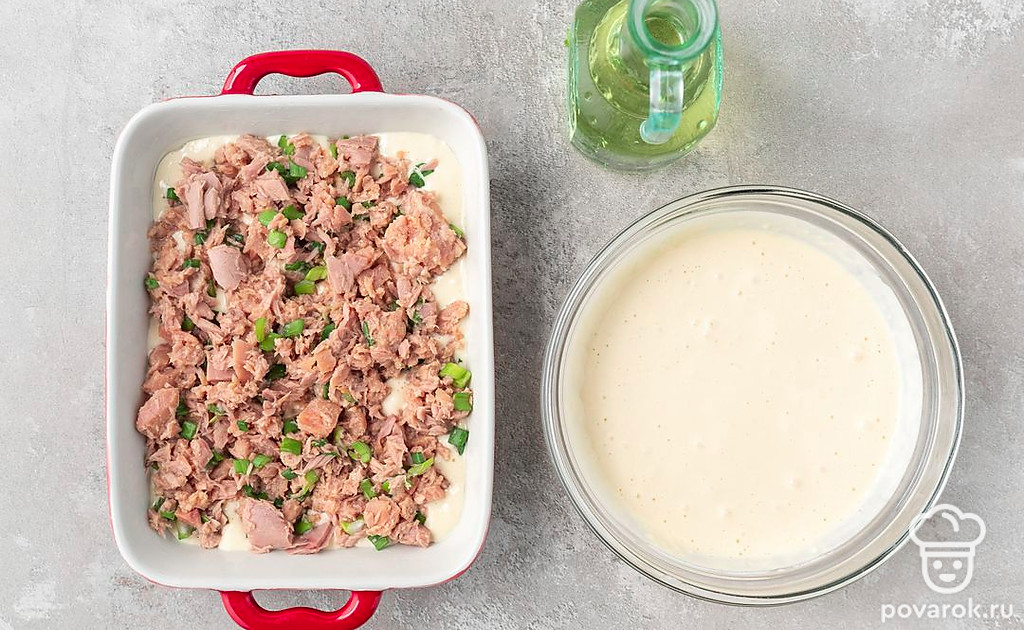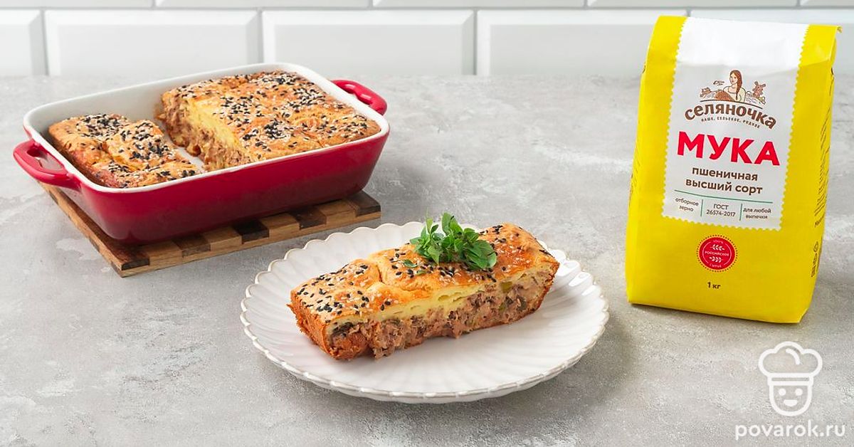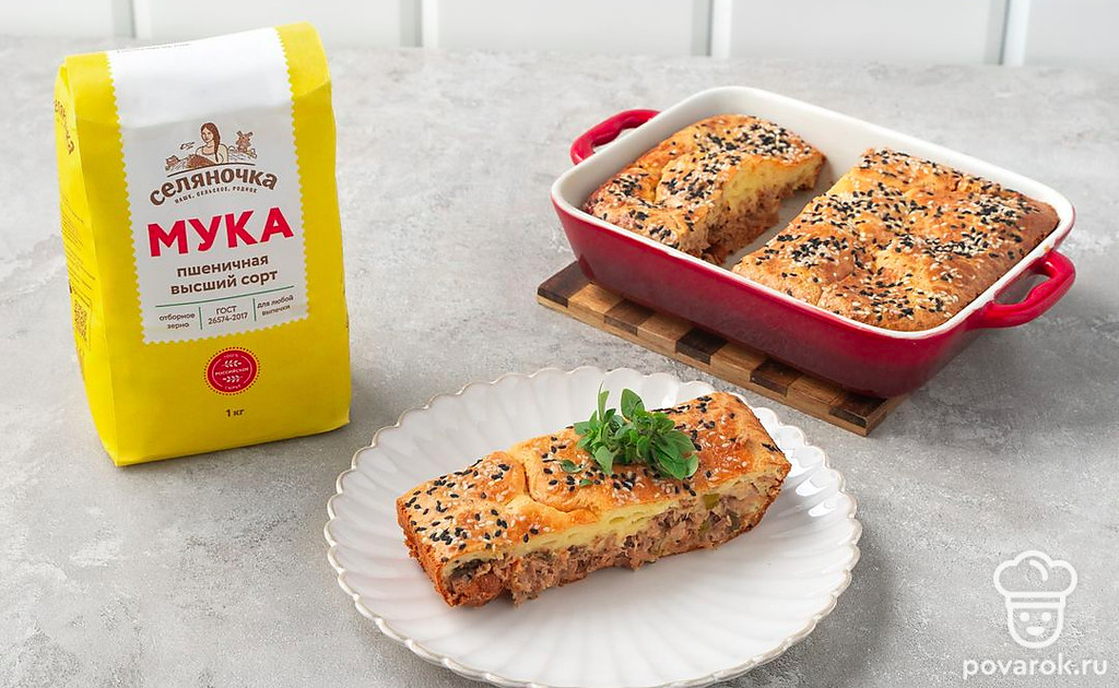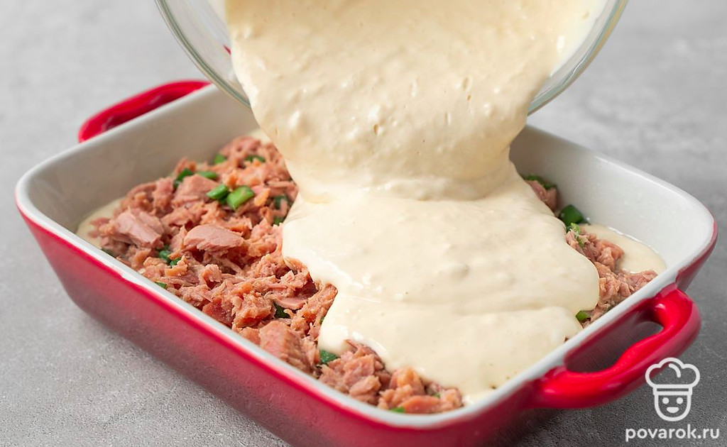 Заливной пирог с тунцом готовится не только просто, но и очень быстро. Сметана с содой сделает тесто пышным, а рыба придаст сытности. Подойдет и тунец в масле, и другие рыбные консервы. Перед отправкой пирога в духовку посыпьте его семенами кунжута или мака.