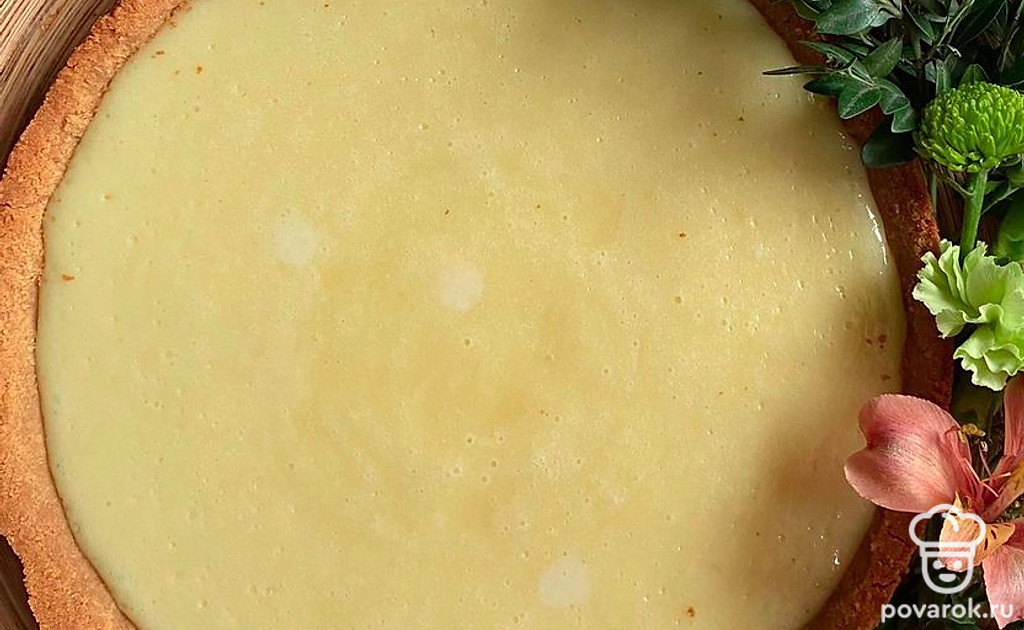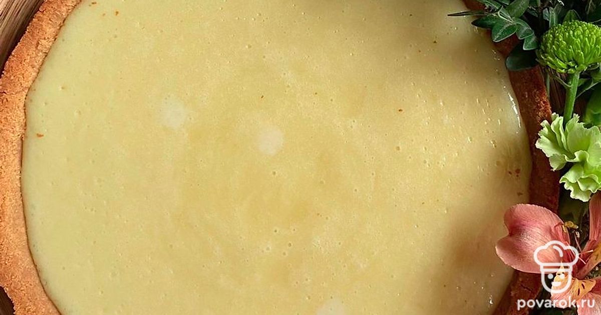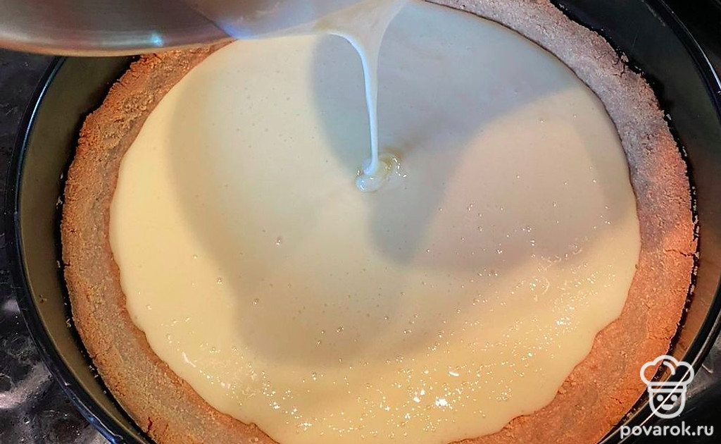 Вылейте полученную начинку в основу для пирога. Поставьте в предварительно разогретую до 180 градусов духовку на 10 минут. После дайте остыть в течение 1-2 часов до загустения начинки. Можете остудить смесь в холодильнике.
